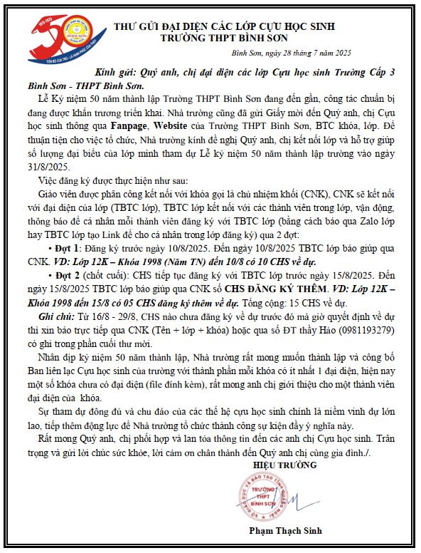 Để Ban tổ chức lớp kết nối các thành viên trong lớp và báo số lượng về dự Lễ kỷ niệm 50 năm thành lập trường vào 31/8/2025 cho chủ nhiệm khối (CNK). Ban tổ chức Lễ kỷ niệm 50 năm thành lập trường gửi QR CODE và LINK thông tin về Trưởng Ban Tổ chức lớp và Trưởng Ban Tổ chức khối của các khóa – lớp.
